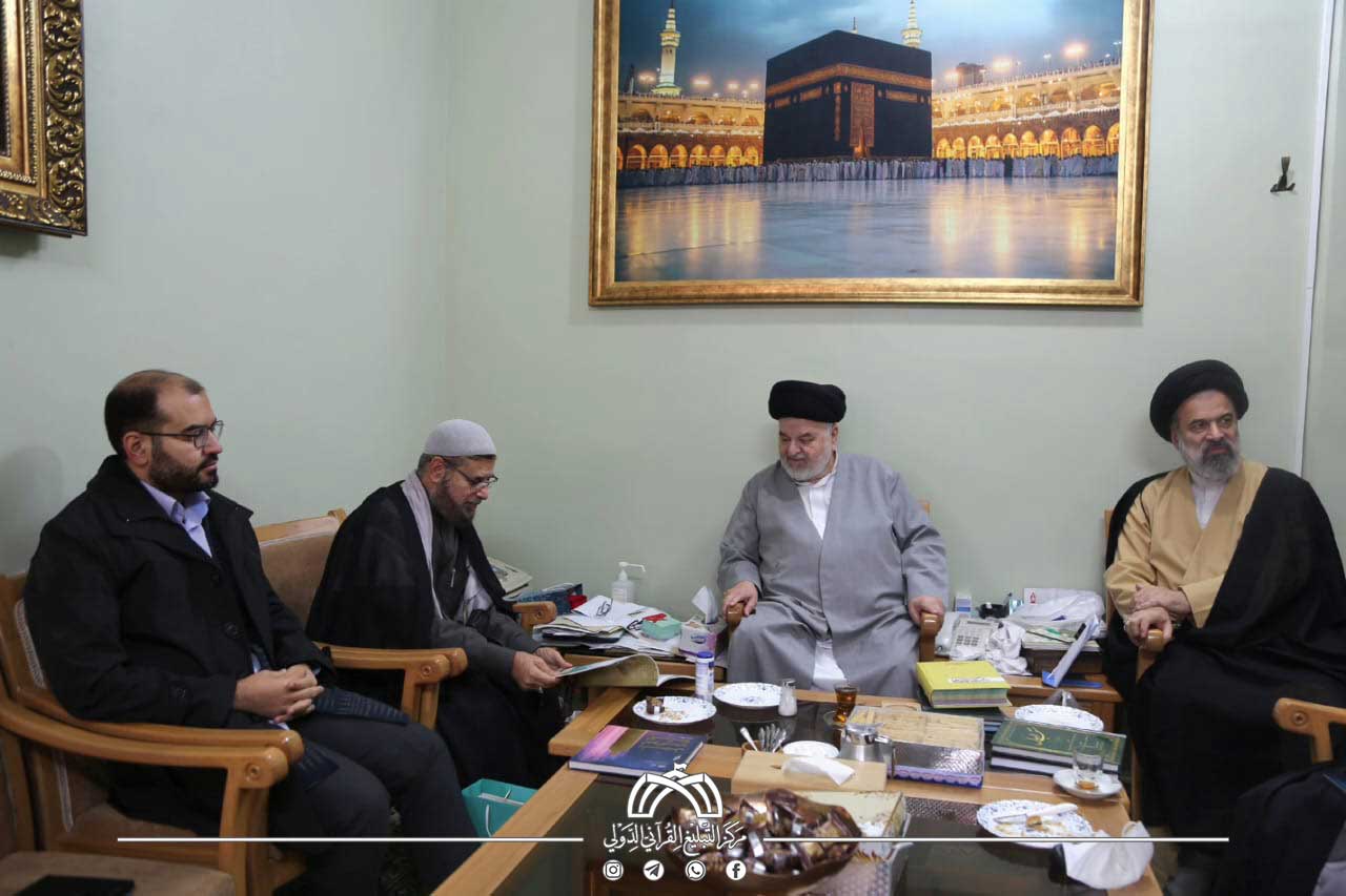 In a related visit, Mr. Muntadar Al-Mansouri, Director of the International Quranic Preaching Center, accompanied by Sheikh Dr. Saleh Al-Wa’eli, Head of the Al-Dalil Foundation for Research and Studies, met with His Eminence Ayatollah Sayed Riyad Al-Hakim. During the meeting, they reviewed the Holy Shrine’s Quranic initiatives, particularly the Imam Hussain Holy Shrine Quran Project and the International Quran Day Project. They also extended a formal invitation to His Eminence to participate and deliver a speech at the Second International Quran Day Forum, which the center is organizing in cooperation with the Al-Dalil Foundation in Qom.
