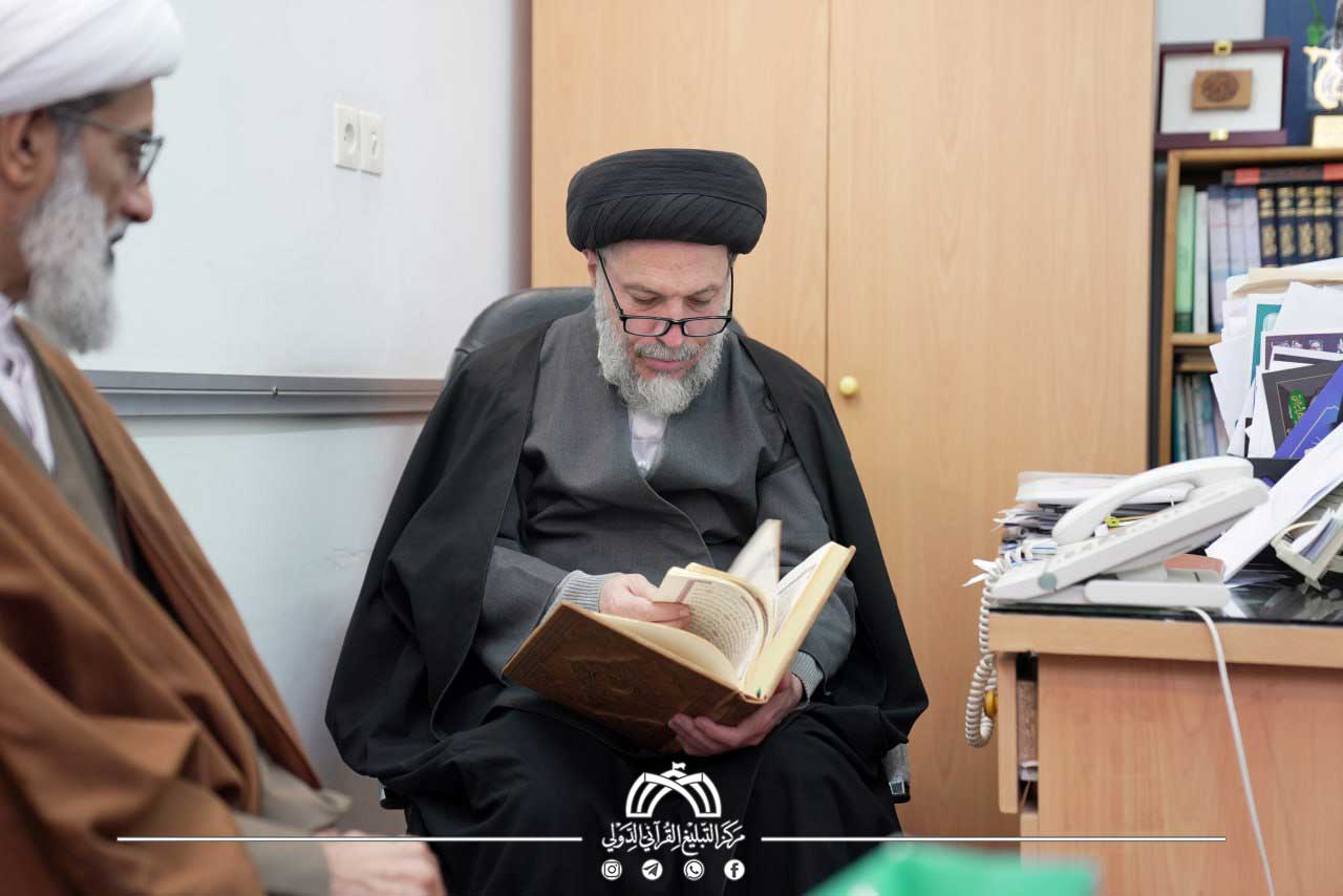 Additionally, the Qom Branch of the International Quranic Preaching Center received His Eminence Sayed Muhammad Sadiq Al-Khorasani, who was briefed on the international Quranic projects supervised by the center, including the Holy Quran of the Holy Shrine of Imam Hussain (peace be upon him) utilizing QR technology. His Eminence expressed his appreciation and blessing for the efforts to launch International Quran Day and prayed for continued success and divine guidance for those involved. At the conclusion of the visit, he presented several of his recent scholarly publications.