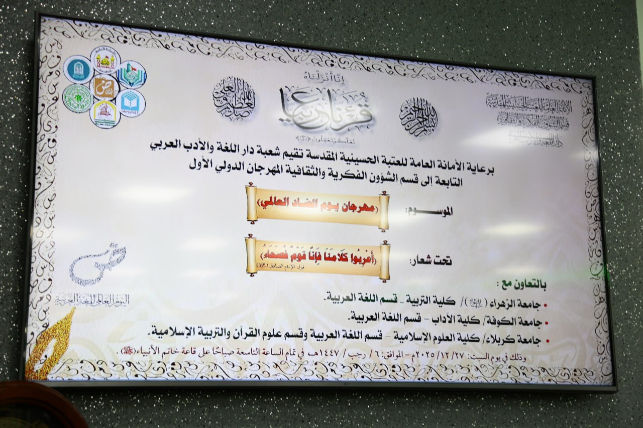 Hz. Hüseyin (a.s) Türbesi’ne bağlı Fikrî ve Kültürel İşler Bölümü bünyesinde faaliyet gösteren Arap Dili Evi, türbeye ait Hâtemul Enbiya Salonu’nda Dünya Arap Dili Günü etkinliği düzenledi. Kûfe Üniversitesi, Kerbela Üniversitesi ve Zehrâ Üniversitesi (a.s) iş birliğiyle gerçekleştirilen etkinliğe alanında uzman çok sayıda akademisyen geniş katılım gösterdi.